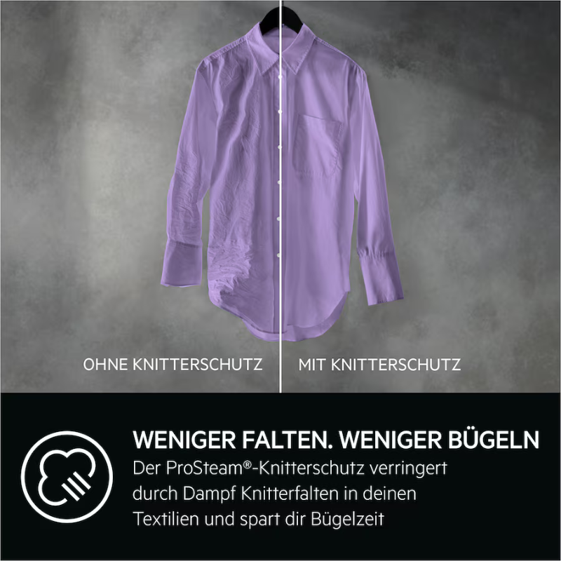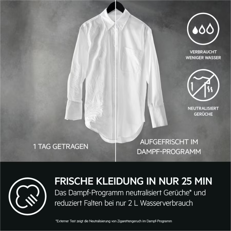 Program s parom neutralizira mirise* i smanjuje nabore na odjeći, uključujući osjetljivu, za samo 25 minuta. Za dodatni učinak svježine, jednostavno dodajte miris rublja AEG Steam Fragrance.