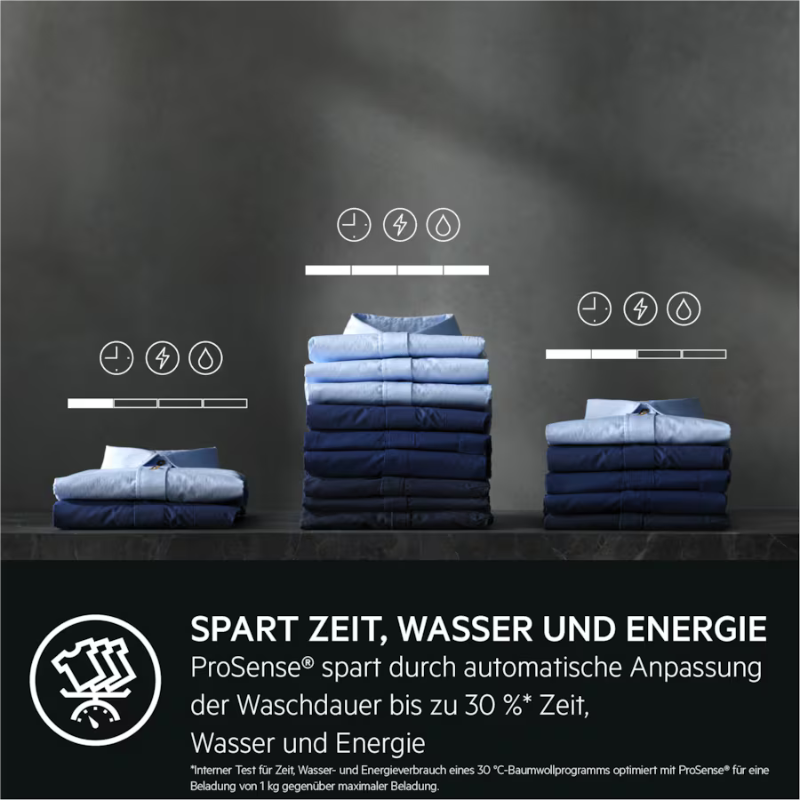 ProSense® senzori za automatsku kontrolu punjenja automatski određuju količinu rublja za prilagođeni ciklus pranja. Potrošnja vremena, vode i energije smanjuje se do 30%*. Na ovaj način, vaše rublje dobiva upravo pravu njegu svaki put kada ga perete.
