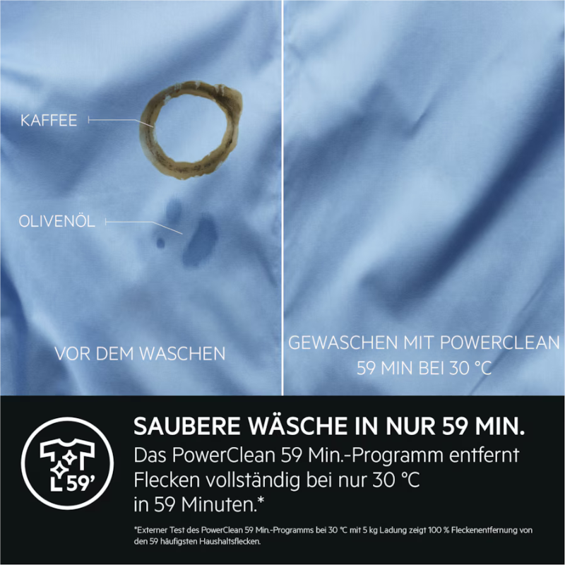 Program PowerClean od 59 minuta potpuno uklanja mrlje na 30°C za manje od sat vremena*. Osigurava da deterdžent dopre do svakog vlakna – tako da je kratki ciklus pranja jednako učinkovit kao i dugi, a mrlje se dokazano uklanjaju bez ostavljanja ikakvih ostataka.