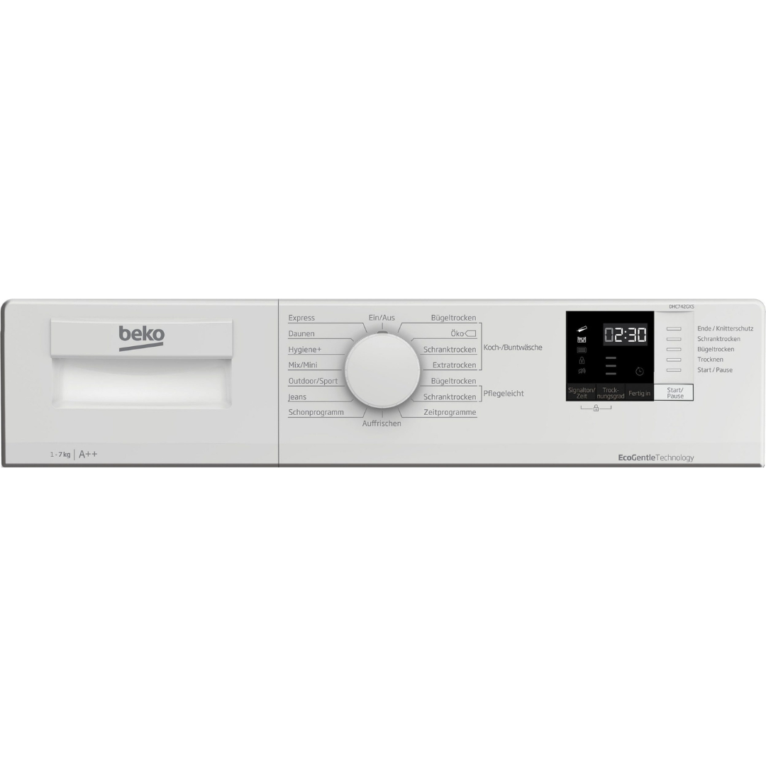 Uz DHC742GXS, BEKO nudi snažnu sušilicu s toplinskom pumpom. Ova sušilica s toplinskom pumpom pruža prvorazredne vrijednosti u pogledu potrošnje energije s razredom energetske učinkovitosti A++ (skala: A+++ do D). S kapacitetom od 7 kg, sušilica s toplinskom pumpom posebno je prikladna za kućanstva od 2 do 3 osobe. Sljedeća posebna značajka karakterizira sušilicu s toplinskom pumpom DHC742GXS: zaštita od gužvanja. Koristeći vremensku odgodu početka, možete individualno postaviti kada DHC742GXS sušilica s toplinskom pumpom treba početi sušiti. Preostalo trajanje programa prikazano je na zaslonu preostalog vremena. To znači da uvijek možete vidjeti koliko dugo sušilica s toplinskom pumpom još treba da se suši. Budući da pokazuje kada filtar treba očistiti, možete vidjeti sve relevantne informacije o čišćenju. Sušilica s toplinskom pumpom DHC742GXS ima bubanj za rublje od nehrđajućeg čelika i staklena vrata kroz koja u svakom trenutku možete držati odjeću na oku. Kako bi zaštitili najmanje članove obitelji, sušilica s toplinskom pumpom DHC742GXS ima dječju bravu. S dimenzijama od 59,7 cm x 84,6 cm x 50,8 cm (ŠxVxD), sušilica s toplinskom pumpom atraktivno spaja oblik i funkciju.