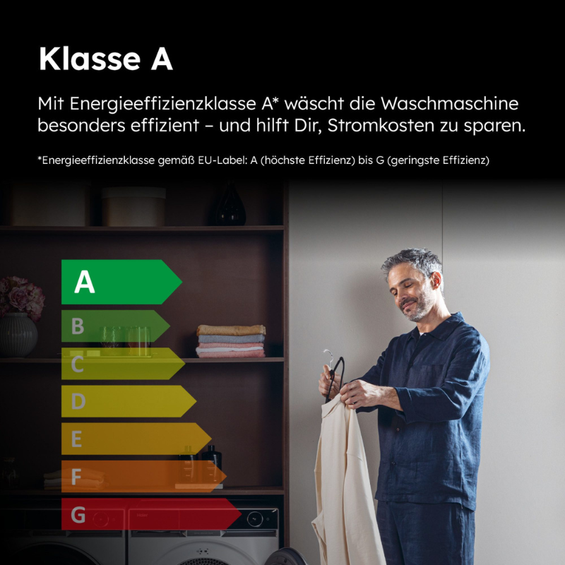 Zahvaljujući svojoj vrlo inovativnoj tehnologiji motora, ova perilica rublja postiže energetsku učinkovitost klase A. Potrošnja energije po ciklusu pranja stoga je prilično niska, što štedi i vaš novčanik i okoliš. U usporedbi s uređajem s oznakom G, uštedite do 51% električne energije – nešto više od polovice. To se prevodi u značajne uštede tijekom godina.