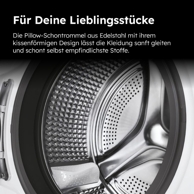 Ovaj model s apsolutnom nježnošću rukuje osjetljivim rubljem, tako da čak i svoje omiljene predmete možete prati mirne savjesti. Dizajn površine u obliku jastuka novo razvijenog, laserski zavarenog bubnja s jastucima osigurava da se u njega ne zaglave tekstilna vlakna. Čak i najosjetljivija odjeća glatko klizi po površini i optimalno je zaštićena sa svakim ciklusom pranja.