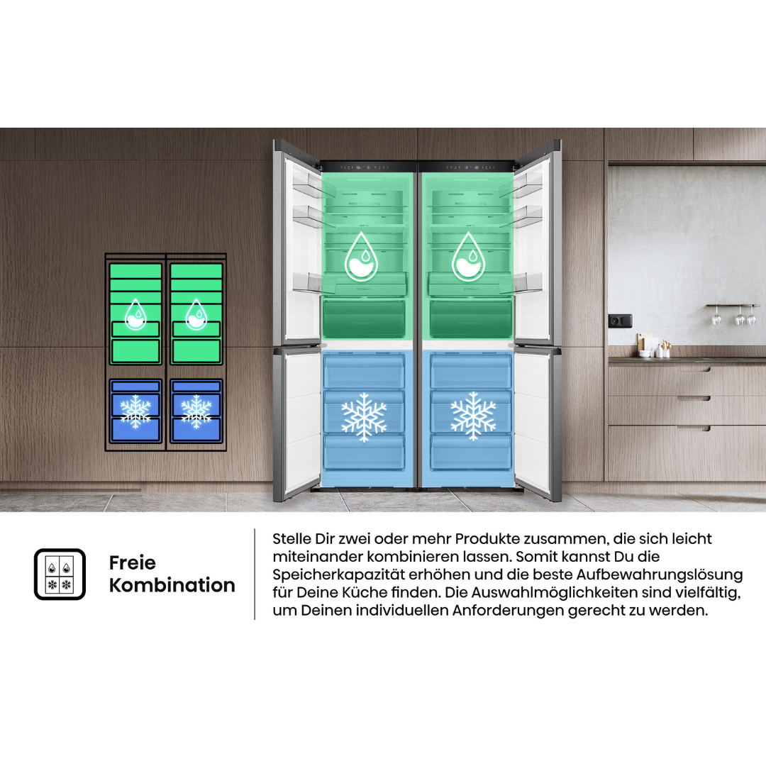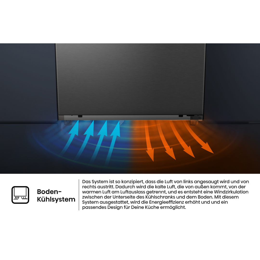 Sustav je dizajniran tako da se zrak uvlači s lijeve strane, a izlazi s desne. To odvaja hladni zrak koji dolazi izvana od toplog zraka na izlazu, stvarajući cirkulaciju zraka između dna hladnjaka i poda. Opremljen ovim sustavom, povećava se energetska učinkovitost i moguć je dizajn koji nadopunjuje vašu kuhinju.