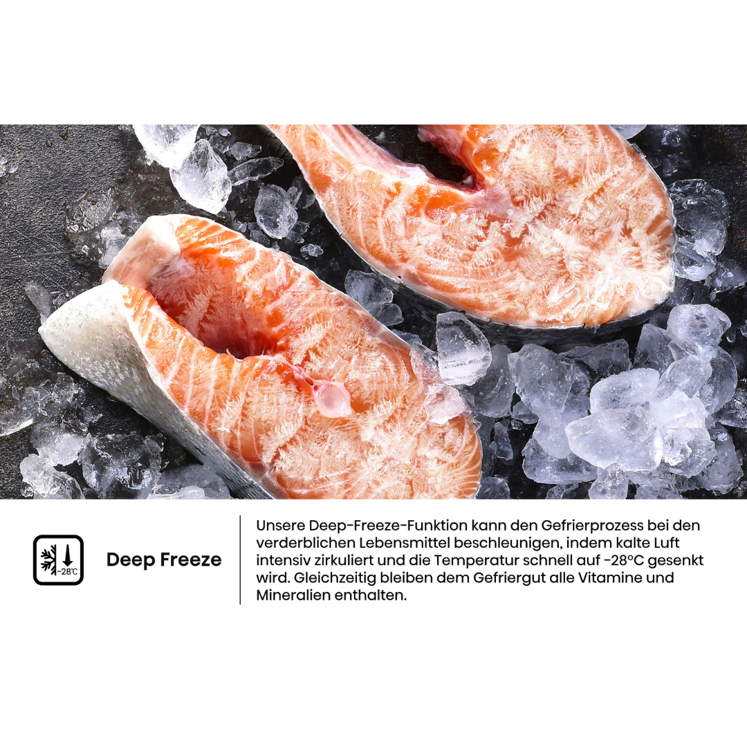 Naša funkcija dubokog zamrzavanja ubrzava proces zamrzavanja kvarljive hrane intenzivnom cirkulacijom hladnog zraka i brzim snižavanjem temperature na -28°C. Istovremeno, svi vitamini i minerali ostaju u smrznutoj hrani.
