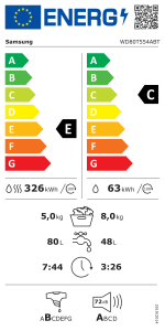 WD80T554ABT je perilica-sušilica iz SAMSUNG-a. Ugrađeni inverterski motor osigurava tih i dugotrajan rad. Uz radnu buku od samo 72 dB tijekom centrifuge, perilica-sušilica rublja WD80T554ABT je akustički jedva primjetna. Sljedeće vrhunske značajke karakteriziraju perilicu-sušilicu rublja WD80T554ABT: Diamond bubanj za njegu, funkcija ponovnog punjenja, samočišćenje, samočisteća ladica i WiFi Smart Control. Dostupno je 7 standardnih programa i 18 dodatnih programa. Količinu vode automatski podešava automatska kontrola glasnoće jer pomoću senzora detektira koliko je rublja u bubnju. Uz praktičnu funkciju ponovnog punjenja, stroj se jednostavno zaustavlja tijekom programa i može se dodati zaboravljeno rublje. Čišćenje zahtijeva manje truda jer model ima ladicu za samočišćenje i program za čišćenje bubnja. Zahvaljujući integriranom sustavu za zaštitu od vode “puna zaštita od vode”, perilica-sušilica rublja WD80T554ABT sprječava oštećenja od vode. Model se također može zaključati pomoću funkcije dječje brave. Dimenzije perilice sušilice su 60 cm x 85 cm x 68,5 cm (ŠxVxD).
