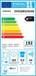 DV91BB5245AB je sušilica s toplinskom pumpom tvrtke Samsung. S razredom energetske učinkovitosti A+++ (ljestvica: A+++ do D), potrošnja energije ove sušilice s toplinskom pumpom iznimno je niska. Zahtjevi za kapacitetom za obitelji od 5 ili više ljudi nisu problem s kapacitetom od 9 kg Uz tihu radnu buku, sušilica s toplinskom pumpom može se lako sušiti i noću. Visokokvalitetni bubanj od nehrđajućeg čelika osigurava dug radni vijek sušilice s toplinskom pumpom DV91BB5245AB. Zahvaljujući staklenim vratima svoju odjeću uvijek možete držati na oku. Osim toga, sušilica s toplinskom pumpom DV91BB5245AB može se zaključati pomoću funkcije dječje brave. S dimenzijama od 60 cm x 85 cm x 60 cm (ŠxVxD), sušilica s toplinskom pumpom atraktivno spaja oblik i funkciju.