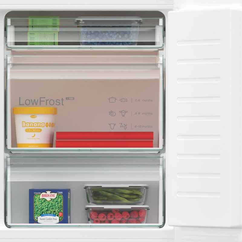 Tehnologija lowFrost, sa svojim posebnim isparivačem, smanjuje nakupljanje leda na minimum. Mala količina leda koja se stvori ravnomjerno se raspoređuje, što odmrzavanje čini brzim i jednostavnim te održava nisku potrošnju energije vašeg hladnjaka. Smanjite napor odmrzavanja uz lowFrost.